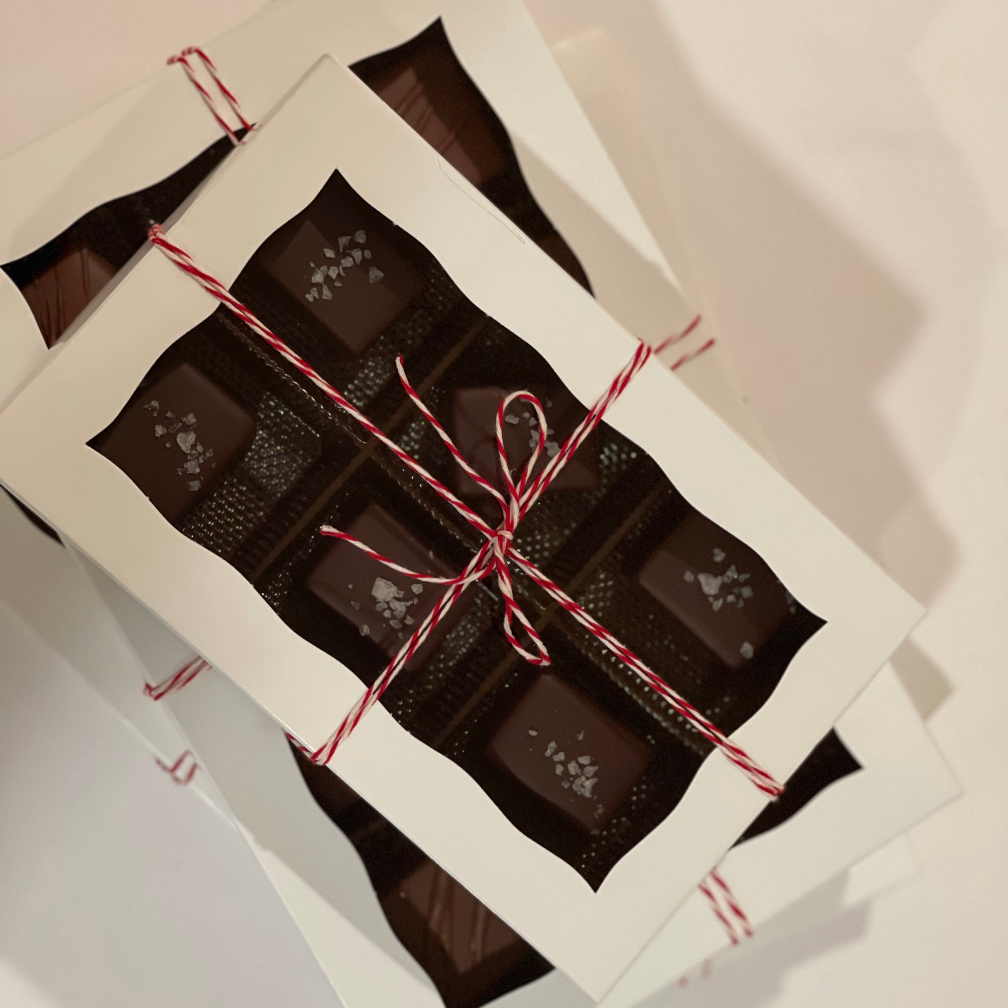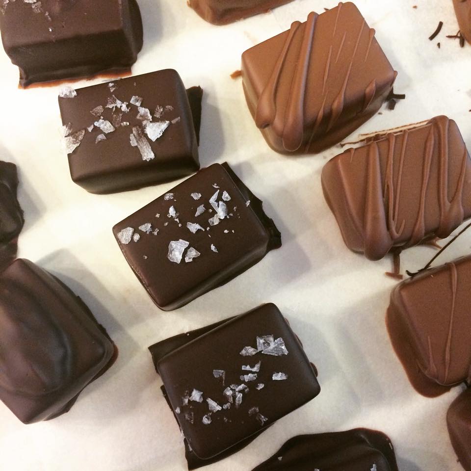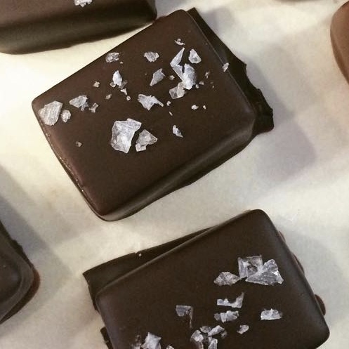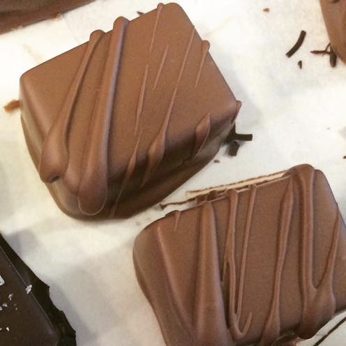 A holiday favorite, soft vanilla bean salted caramels, dipped in dark or milk chocolate. The dark chocolate is topped with a touch of sea salt. Or try my version of a turtle with the addition of a candied pecan.
